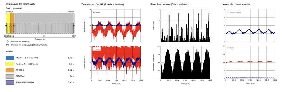 Le logiciel WUFI permet d’anticiper les phénomènes de condensation dans les parois et de choisir les bons matériaux (pare-vapeur, frein vapeur, membranes) en fonction de votre configuration chantier, des orientations, des zones climatiques et des performances souhaitées.
